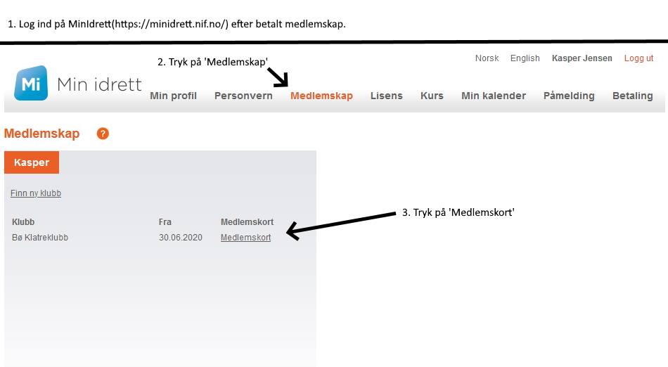 Medlemskortet skal printes ut fra NIF sine sider(https://minidrett.nif.no) og ikke hentes på Nr. 1 Fitness som tidligere. Gjør som på bildet: